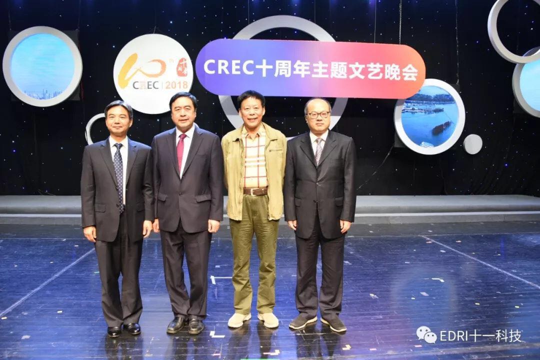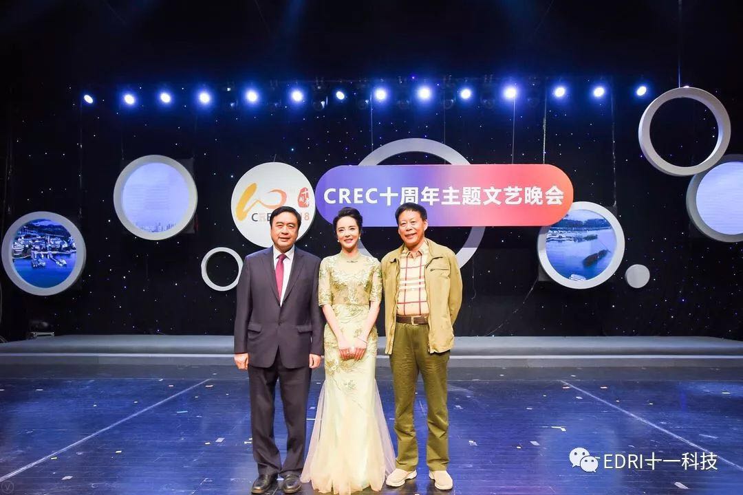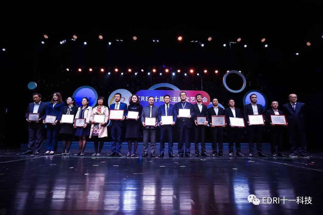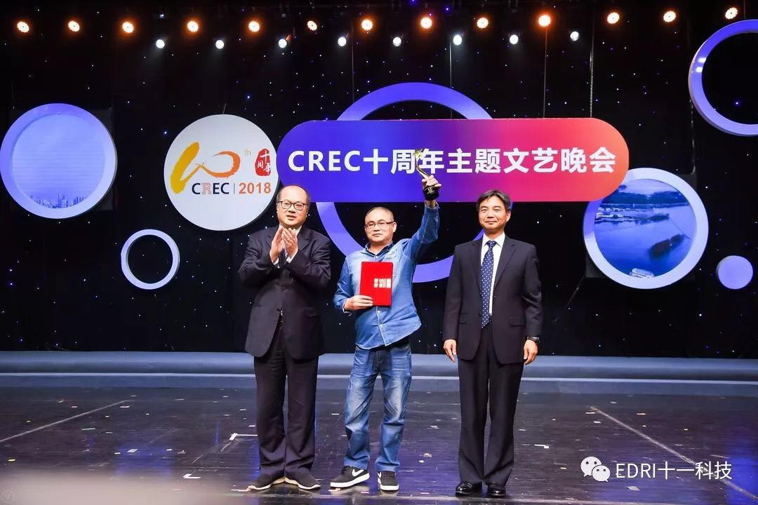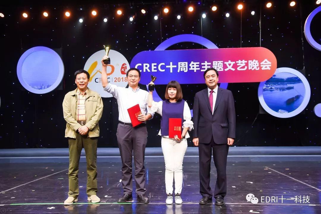 十一科技榮獲CREC十周年“卓越貢獻獎”企業,趙振元同志榮獲CREC十周年“卓越貢獻獎”個人,余才志同志代表十一科技上臺領獎。