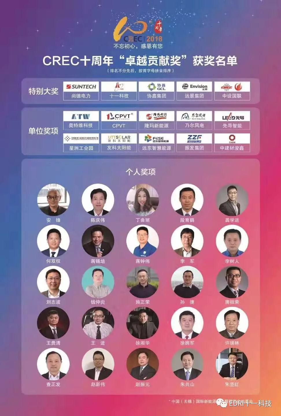 今年是無錫新能源大會走過的第十個年頭,十年期間,無錫新能源大會得到了社會各界的大力支持,組委會設立CREC十周年“卓越貢獻獎”,以表彰十年來對展會做出突出貢獻的企業和個人。