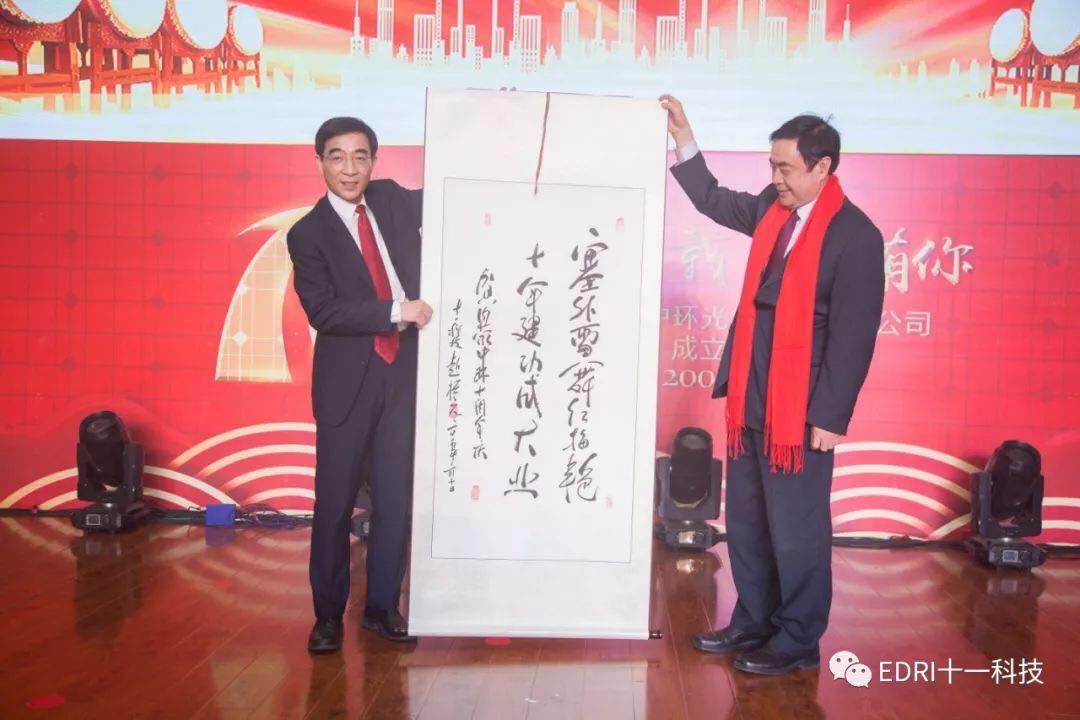 詩歌飽含歷史深情與美好祝愿,并刻錄在精美的紀念禮品中與趙振元親自書寫了的作品一起贈予中環。沈浩平同志給予高度評價,并感謝趙振元親自送上的珍貴禮物。兩位電子信息的大咖還就我國信息產業的發展和雙方的合作進行了非常親切地交流。