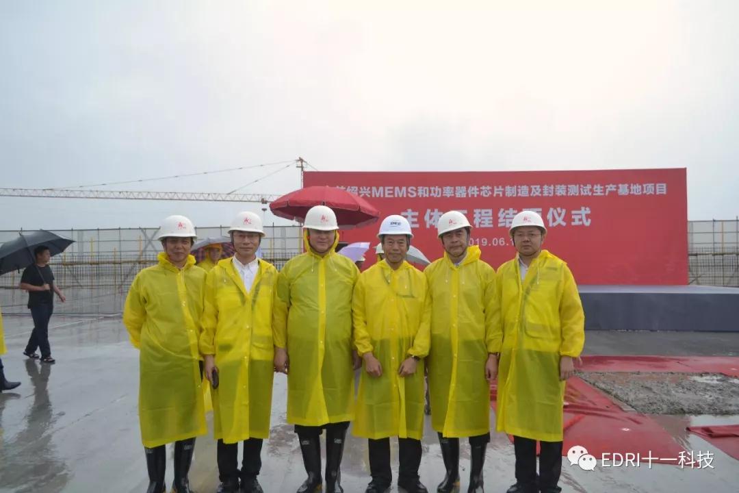 中芯紹興項目在雨中進行封頂儀式,馬衛光、陸維、孫哲君、高永崗、丁國興、趙奇、趙振元、白焰等領導出席。